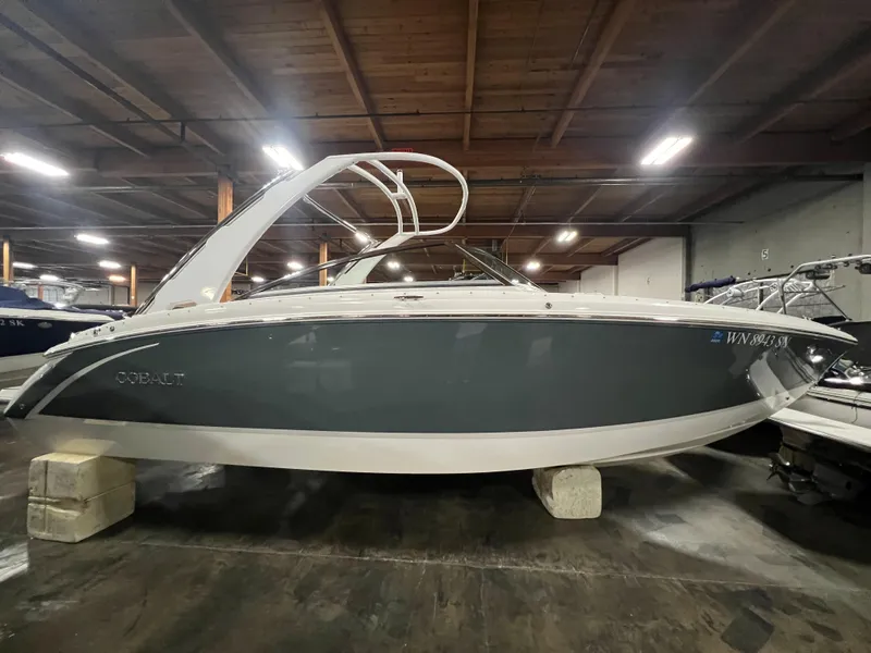 , 2018 Cobalt R5 w/ 120 hours ready for summer boating adventures! Powered by a Volvo Penta V8 380DP, this boat has all the power to pull watersports or cruise the lake in style. Features include Stainless Steel Arch w/Sunshade (White) Bow and Cockpit Tonneau Covers, Mooring Cover, Sof-Trac Mat (Swim Platform w/Flip Down Swim Step), Sea Grass Floor Covering, Head w/Electric Porcelain Toilet, Sink Console (head compartment), Premium Sound System w/Transom Speakers, Battery Switch, Dual w/ACR, Battery Maintainer/Charger (110v), Windlass, All Chain w/Anchor and more!