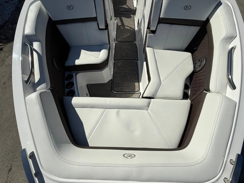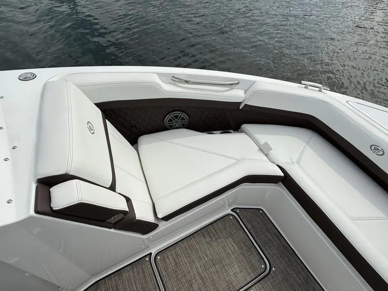 Draped in a Rich Ebony, Graphite Gray, and White exterior with a custom three-color graphic and swim platform accent, the R6 turns heads at every marina. The refined Summit/Cocoa interior pairs beautifully with premium finishes, setting a new standard in luxury boating.