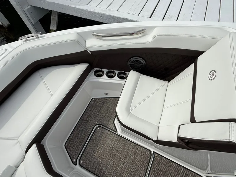 Draped in a Rich Ebony, Graphite Gray, and White exterior with a custom three-color graphic and swim platform accent, the R6 turns heads at every marina. The refined Summit/Cocoa interior pairs beautifully with premium finishes, setting a new standard in luxury boating.