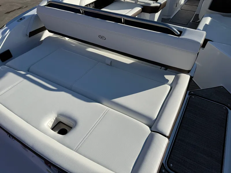 Designed for entertaining and relaxation, the cockpit surrounds guests in yacht-inspired comfort. Sea grass flooring adds durability with upscale texture, while the wood interior accent package and weighted throw pillows elevate the atmosphere beyond typical sport boats. Premium sound with transom speakers ensures every cruise carries the perfect soundtrack, whether underway or anchored in your favorite cove.