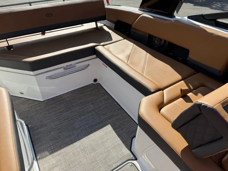 Inside, the Caramel/Carbon interior is complemented by the Dark Driftwood trim package and Sea Grass floor covering, offering a rich, elegant environment that feels more like a luxury lounge than a boat. RGB LED interior accent lighting sets the mood for evening cruises, while the leather color-matched steering wheel and dual Garmin 8610 glass cockpit displays put advanced control right at your fingertips.