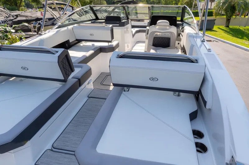 The innovative passenger seat flip backrest system and sundeck convertible lounger let you effortlessly switch from social to chill modes. Enjoy tunes through the Bluetooth sound system, or take a refreshing dip using the swim platform with its flip-down swim step. With features like the glass cockpit with dual Garmin 743 screens, even the captain gets to enjoy a bit of high-tech fun. This boat is truly for those who want to maximize their leisure time with a touch of class.