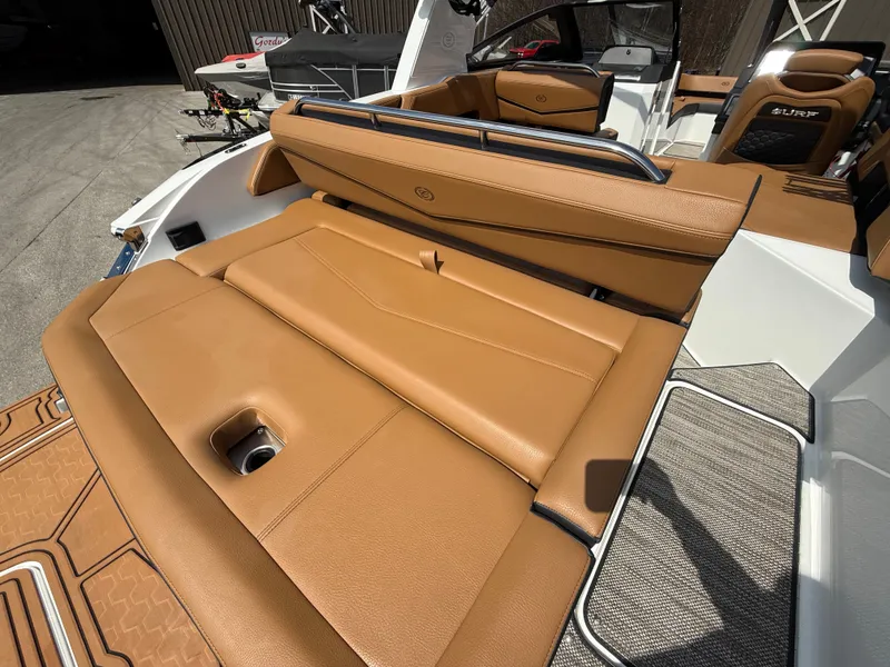From the moment you step aboard, the R6 Surf sets a new standard. The rich Caramel and Carbon interior paired with the Dark Driftwood trim package creates a warm, modern atmosphere that feels more like a premium lounge than a traditional boat. Underfoot, sea grass flooring adds both sophistication and durability, while customizable RGB interior lighting transforms sunset cruises into an elevated nighttime experience.