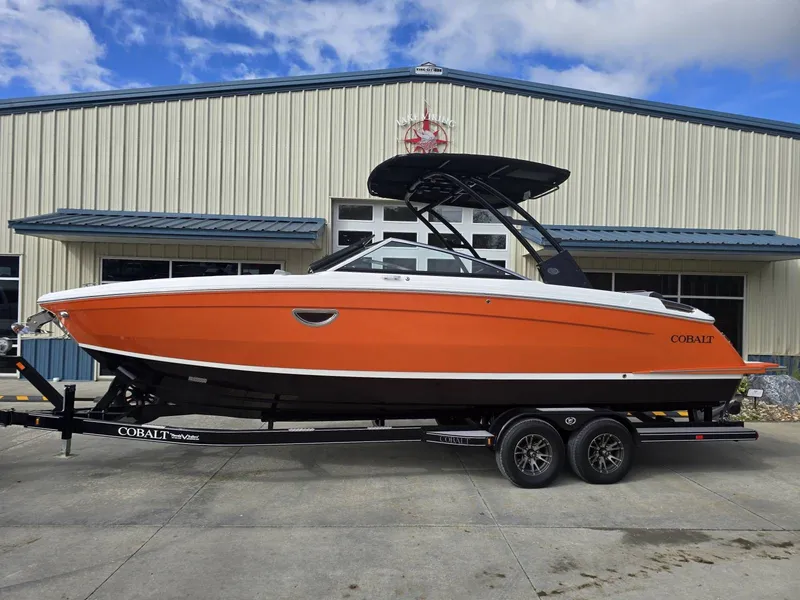 2024 Cobalt R8 , 2024 Cobalt R8 - Style, Power, and Pure Cobalt Luxury The 2024 Cobalt R8 makes a statement before it ever leaves the dock. With its Sunburst Orange hull, Ebony folding arch, and unmistakable Cobalt lines, this boat is built to turn heads and deliver the smooth, confident ride the brand is known for. Highlights & FeaturesFolding black arch with rotating shade - form meets functionPremium Frost & Slate interior with Dark Driftwood trimSeagrass Silver Ash flooring - soft underfoot and easy to cleanRGB interior accent lighting - customizable ambiance day or nightDual Garmin 8610 glass cockpit displays - precision control and navigationPremium sound system with transom speakers and remoteTeak cockpit table with stainless base - perfect for entertainingWindlass with all-chain anchor - effortless anchoringFlip-down swim step and stainless boarding ladderAutomatic fire suppression system and battery chargerBow filler cushions for expanded lounging spaceWireless phone charger, stainless docking lights, and flagpole with ensign In short: this R8 blends athletic performance, luxury finishes, and Cobalt craftsmanship into one striking package - ready to impress at the dock and exhilarate on the open water.