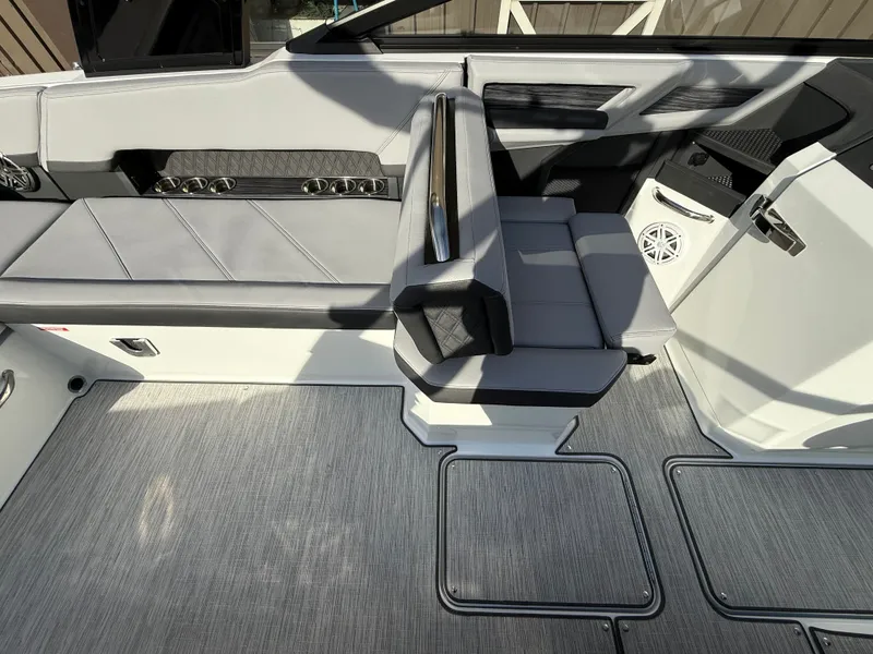 At the helm, the dual Garmin 8610 glass cockpit provides a cutting-edge command center with crystal-clear displays and intuitive controls. Keep your devices powered with the wireless phone charger, and enjoy rich audio from the Premium Sound system with transom speakers-perfect for boat days at anchor or a quiet cruise at dusk.