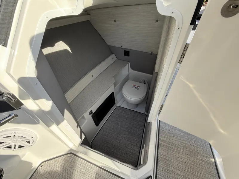 At the helm, the dual Garmin 8610 glass cockpit provides a cutting-edge command center with crystal-clear displays and intuitive controls. Keep your devices powered with the wireless phone charger, and enjoy rich audio from the Premium Sound system with transom speakers-perfect for boat days at anchor or a quiet cruise at dusk.