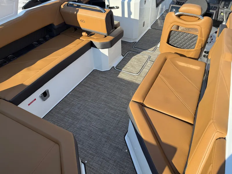 Finished in a stunning Navy hull accented by a bold Knockout Red stripe, this R8 captures attention instantly at the dock while maintaining timeless Cobalt elegance. Step aboard and the Caramel and Carbon interior, paired with the Dark Driftwood trim package, surrounds guests in yacht-inspired craftsmanship - warm textures, refined finishes, and thoughtful design details that elevate every outing.