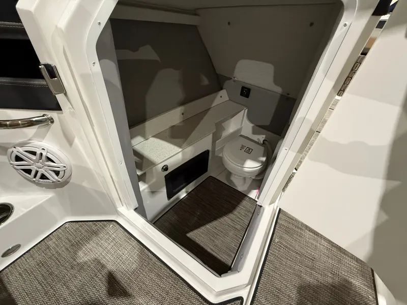 Entertainment and ambiance are second to none. A premium sound system with transom speakers fills the boat with crystal-clear audio, while RGB LED interior accent lighting lets you set the perfect mood for day or night. A classic flagpole adds a finishing touch to the sleek exterior. Comfort and convenience are everywhere you look. Sea grass flooring keeps the cockpit cool and elegant underfoot, and the wood interior accent package adds warmth and style. The electric porcelain head ensures extended days on the water are effortless for family and guests.