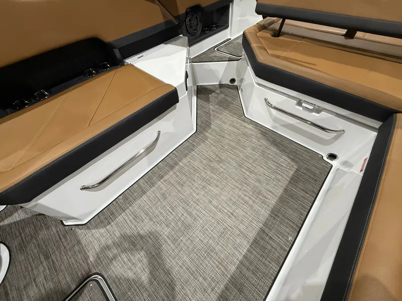 Entertainment and ambiance are second to none. A premium sound system with transom speakers fills the boat with crystal-clear audio, while RGB LED interior accent lighting lets you set the perfect mood for day or night. A classic flagpole adds a finishing touch to the sleek exterior. Comfort and convenience are everywhere you look. Sea grass flooring keeps the cockpit cool and elegant underfoot, and the wood interior accent package adds warmth and style. The electric porcelain head ensures extended days on the water are effortless for family and guests.