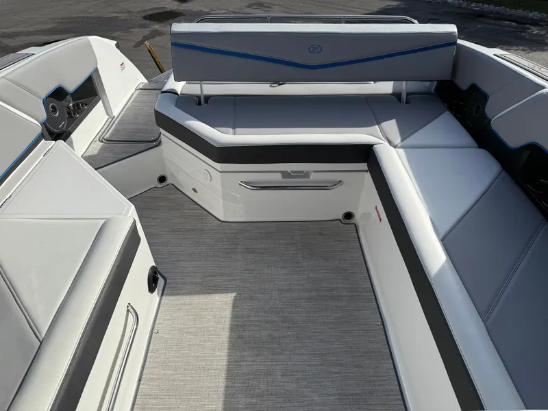 From the sleek Pacific Blue exterior to the luxurious Summit/Frost interior, every detail of this R8 Surf exudes style. Hit the water with confidence using the dual Garmin 8610 glass cockpit, rear-facing camera, and electric helm seat, while keeping passengers cozy with the cockpit heater with pull-out vent. The Sof-Trac mats, bow filler cushions, and premium sound system with transom speakers ensure that every ride is both comfortable and thrilling.