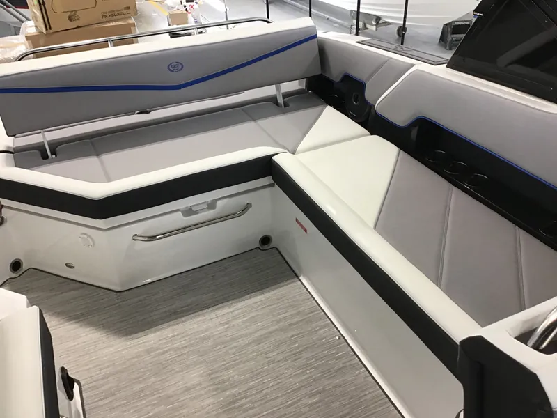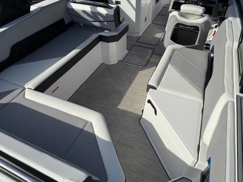 From the sleek Pacific Blue exterior to the luxurious Summit/Frost interior, every detail of this R8 Surf exudes style. Hit the water with confidence using the dual Garmin 8610 glass cockpit, rear-facing camera, and electric helm seat, while keeping passengers cozy with the cockpit heater with pull-out vent. The Sof-Trac mats, bow filler cushions, and premium sound system with transom speakers ensure that every ride is both comfortable and thrilling.