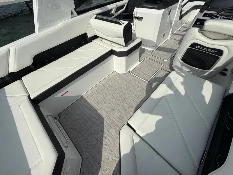 Superior Surf Technology: Equipped with Cobalt’s advanced surf system, the R8 Surf creates perfectly shaped, customizable waves ideal for surfers of all skill levels. 2. Luxurious Interior: High-quality materials and thoughtful design provide a comfortable and stylish cabin with ample seating and storage. 3. Powerful Performance: With a robust engine lineup, the R8 Surf delivers strong acceleration and smooth handling on the water. 4. Innovative Controls: User-friendly digital interfaces and controls make it easy to adjust wave settings and boat functions. 5. Versatility: Designed for both surfing and general recreational boating, it appeals to a wide range of water sports enthusiasts. 6. Attention to Detail: Cobalt’s reputation for craftsmanship is evident in every aspect of the boat, from the hull design to the finishing touches.