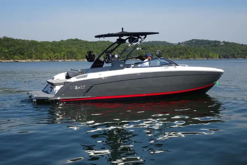 This is a new 2026 Cobalt R8 Surf featuring a Graphite Grey Hull Side, KO Red Accent Stripe, and a Rich Ebony Bottom. It has the Frost/Slate Interior package and is powered by a Volvo Penta 380hp FWD EVC Dual Prop. Other options include: