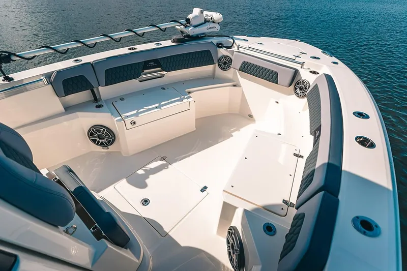 Additional upgrades include a Garmin Force Kraken trolling motor and enhanced JL Audio sound system packages with 10" subwoofers and up to 10 speakers that are strategically positioned to optimize the sound no matter where you are sitting, standing or fishing from on the boat. With an LOA of 28' 5", a beam of 9' 11" and versatile seating options, you'll have plenty of room for all your crew. Get to your favorite spot faster and fish all day with multiple twin engine options - up to 700 maximum horsepower. The helm can accommodate dual 16" Garmin screens, so navigating is second nature. The premium helm seat with tackle center and cooler with slide is standard on the Open or opt in for a version that includes space for more tackle, prep or an added Seakeeper 1.