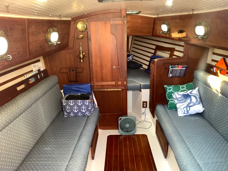 . It can sleep up to six people with a V-berth forward, a convertible dinette double berth, and two settee berths. The interior features standing headroom of over 6 feet, extensive teak trim, and ample ventilation from multiple hatches and eight opening bronze portholes. A full galley and an enclosed marine head with a shower are also included, with storage space available under seats and in a dedicated hanging locker. The folding dinette table adds to the usable space, making the boat's interior feel bright, airy, and well-appointed for its size.