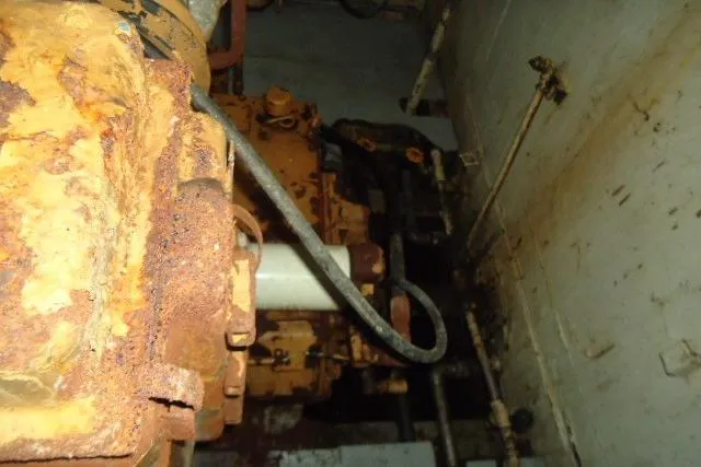 The engine is equipped with lube oil pressure and freshwater temperature alarm system and day tank float alarm and is cooled through a closed fresh water-cooling system-using keel cooler. The engine is fitted with dry exhaust. Atop the console in the pilothouse is the engine controls and monitoring gauges. The stuffing box gland is properly secured.