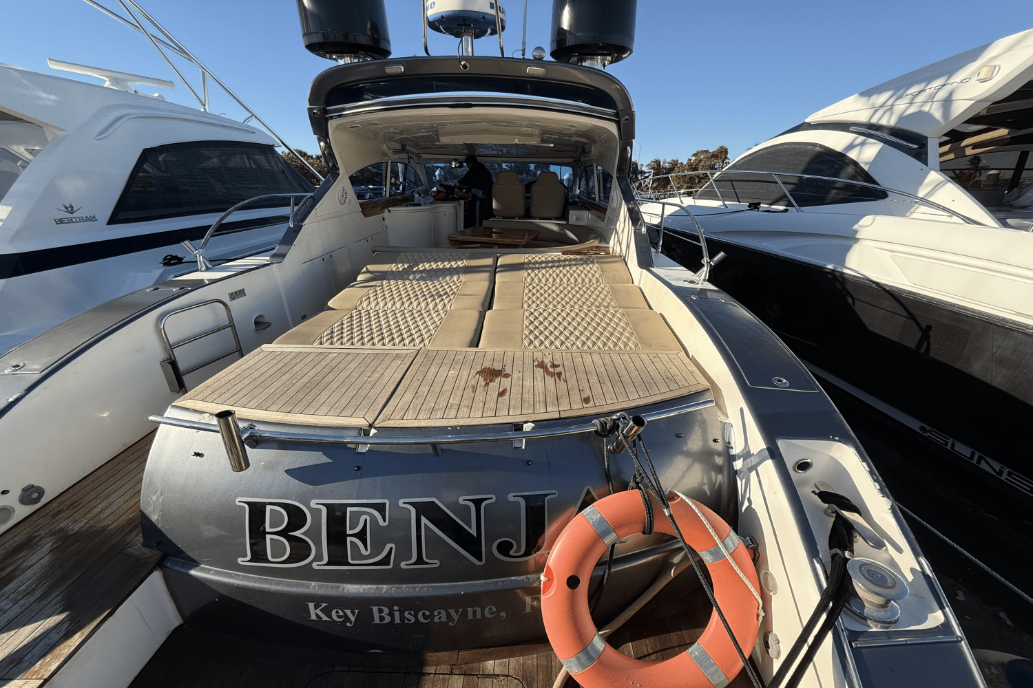 The large enclosed cockpit offers a large living area for your guests, with a 6 person sofa and a fold up table that provides additional table space that can also be lowered creating a large berth for your guests. The salon features elegant wood trim with leather sofa in the Galley which highlights this rich design. With a retractable hardtop roof, you can electronically raise the roof to let in that fresh ocean breeze into the cockpit. In addition, the port and starboard windows can be lowered with the push of a button. Port side, you have a freshwater sink with both hot and cold water. You have a cooktop equipped with 2 gas burners and a refrigerator. Two large leather pilot seats give you a great view while you captain the boat and easy access to the helm station and your electronics. Spacious sunbeds on both the foredeck and the aft deck give you plenty of space to soak in the sunshine. With the electronic swim platform and the hydraulic gangway, your guests will have an easy time getting on and off the boat.