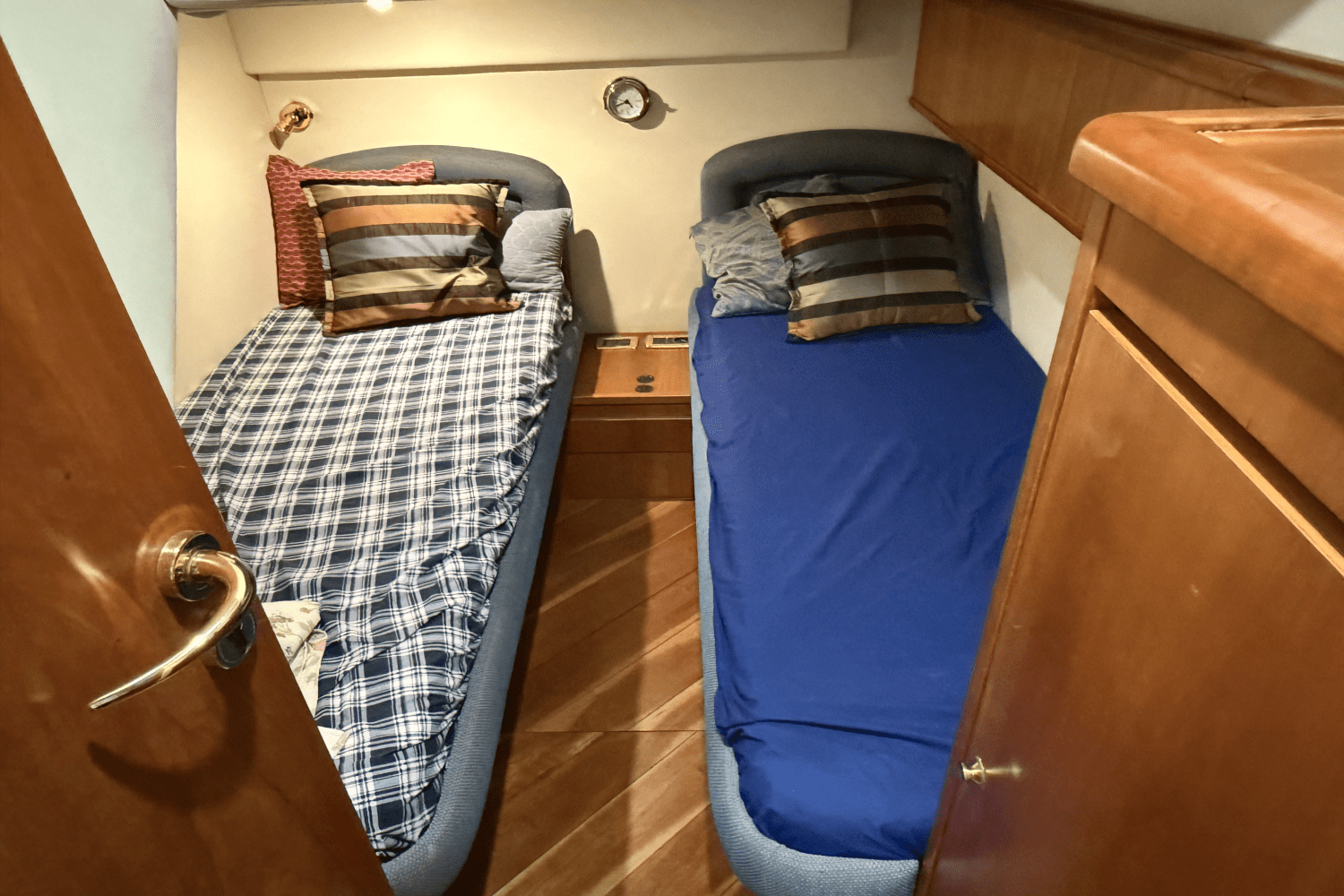 Down below deck, you have 3 cabins for up to 6 guests to sleep comfortably. The Master Stateroom has the queen island berth while the other 2 staterooms have twin beds. Each cabin is set with their own AC unit and thermostat for maximum comfortability. Each cabin has their own TV as well as plenty of stotage space.