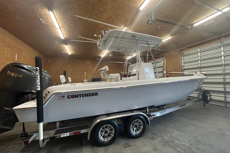 Introducing the 2024 Contender 24 Sport, a stunning center console boat that exemplifies both performance and style. With an overall length of 24.5 feet, this vessel is designed for those who appreciate the thrill of the open water. The deep vee hull shape, crafted from durable fiberglass, ensures a smooth and stable ride, making it perfect for both leisurely outings and adventurous excursions. Powered by twin Yamaha outboard engines, each delivering 150 horsepower, this boat promises an exhilarating experience on the water. With only 1 hour of use, these engines are brand new, ready to take you on your next adventure. The Contender 24 Sport also features modern equipment, enhancing your boating experience. This boat is ideal for those seeking a reliable and stylish option for their maritime activities, combining functionality with a sleek design. Get ready to make unforgettable memories on the water with this exceptional vessel!