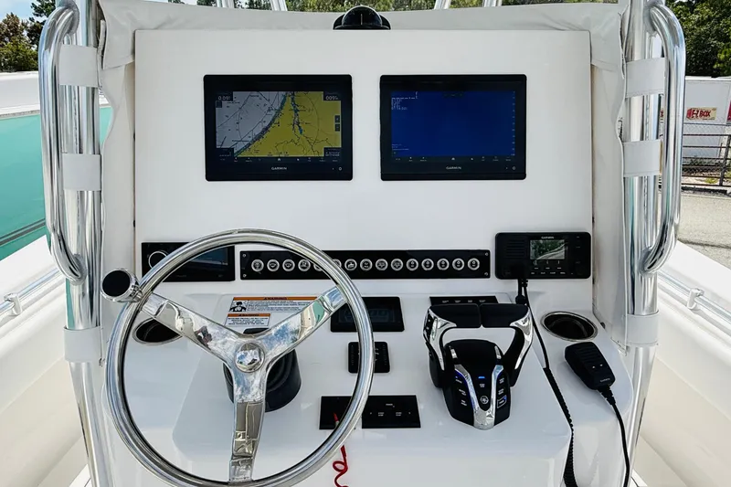 - Dual Garmin touchscreen displays with chartplotter, GPS, depth finder, fishfinder, and radar