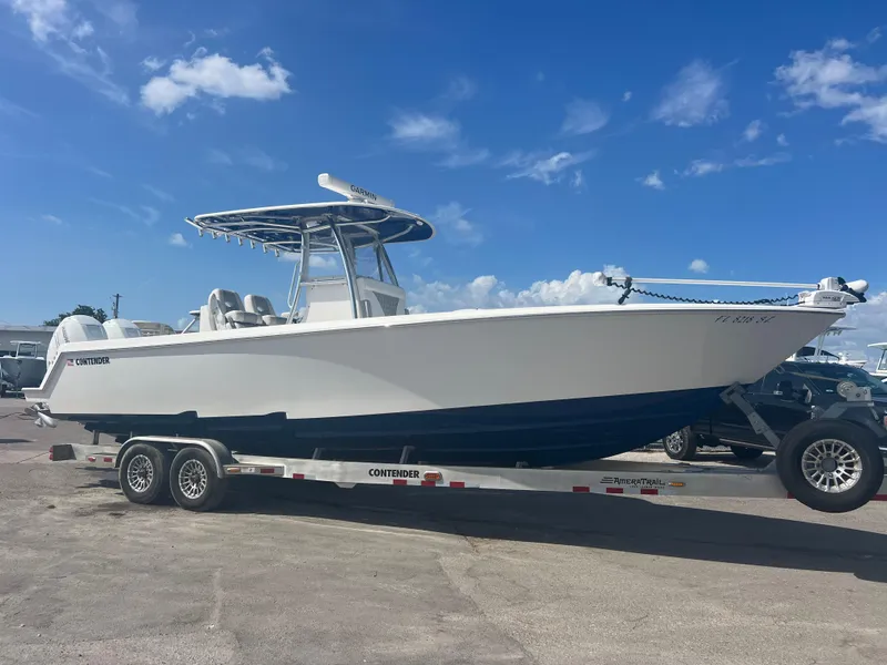 SEA KEEPER 2 Gyro Stabilizer Included!! TRAILER Included!! This Contender 32 ST is absolutely beautiful and has amazing power with the Mercury 400 HP Verados! These engines only have 372 hours and Mercury Warranty on them till 7/1/2026! This is a single owner boat & was custom ordered with the Sea Keeper 2 Gyro which was installed at the Contender Factory under the rear deck for incredible performance and reduces the roll by about 95%. This drastically reduces sea sickness and fatigue while out on the open water making you and your crew much more comfortable throughout the day. The boat has been kept on a lift with a roof over it and a full boat cover on it it's whole life. It is loaded with Electronics & Equipment including Dual Garmin 16" Screens (8616 XSV's), Open Array Radar - Fantom, Minn Kota Trolling Motor, LED Light Bar, & VHF Radio. The Amera Trailer is in great shape and was very rarely used. This boat is a must see. Please contact us for more info. Sea Trials available.