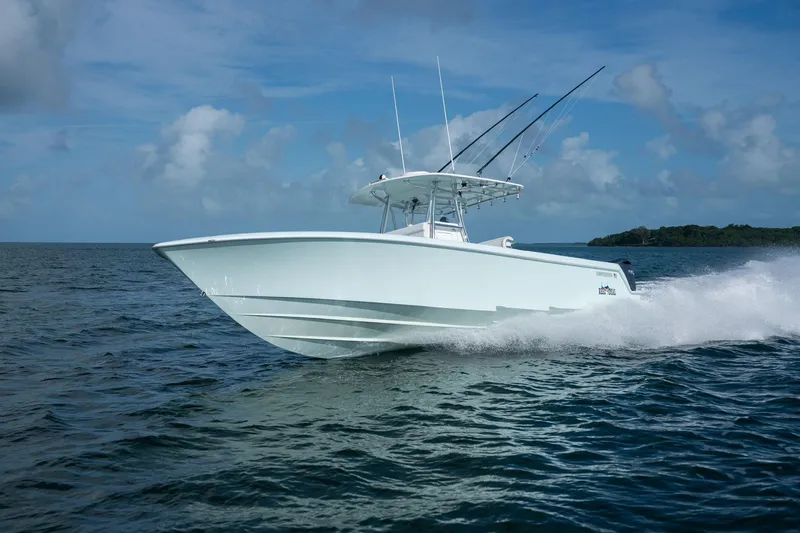 On deck, the boat is outfitted for serious anglers: three livewells, an electric-lift coffin box, Gemlux rigging hardware, four electric reel outlets, heavy-duty sea-chest plumbing, and a smart battery system with wireless activation. Comfort features include Frigid Rigid electric cooler, leaning post, teak console interior, and full Lumitec lighting for night runs. Paired with a Sport-Trailer triple-axle trailer, this 39 ST is turnkey and ready to fish immediately.