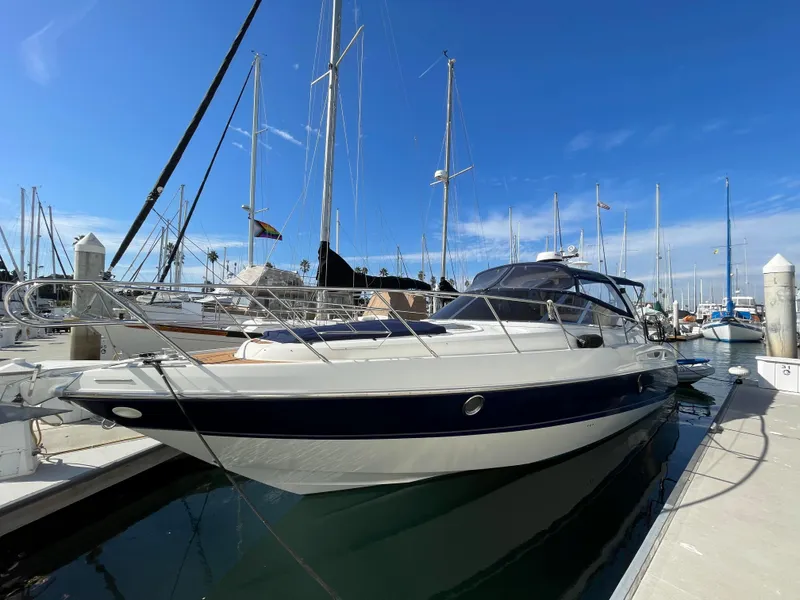 This Italian express cruiser has a huge cockpit with a dinghy garage, and sun pad aft and a foredeck with sunpad. Large swim platform. Luxurious interior with a mid-berth and convertible U shaped settee dinette forward.
