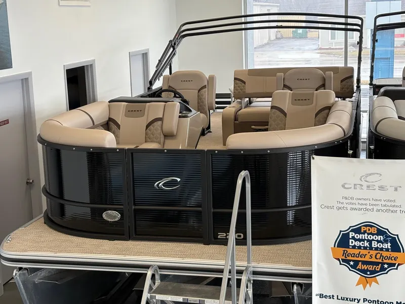 The 2025 Crest 220 SLSC Classic LX is a stylish and functional pontoon boat designed for both relaxation and entertainment. With a length of 22 feet, it features dual captain's chairs and a swing-back lounge, offering versatile seating options for up to 13 passengers. Built with a durable aluminum frame and oversized pontoons, it ensures stability and safety on various water conditions.