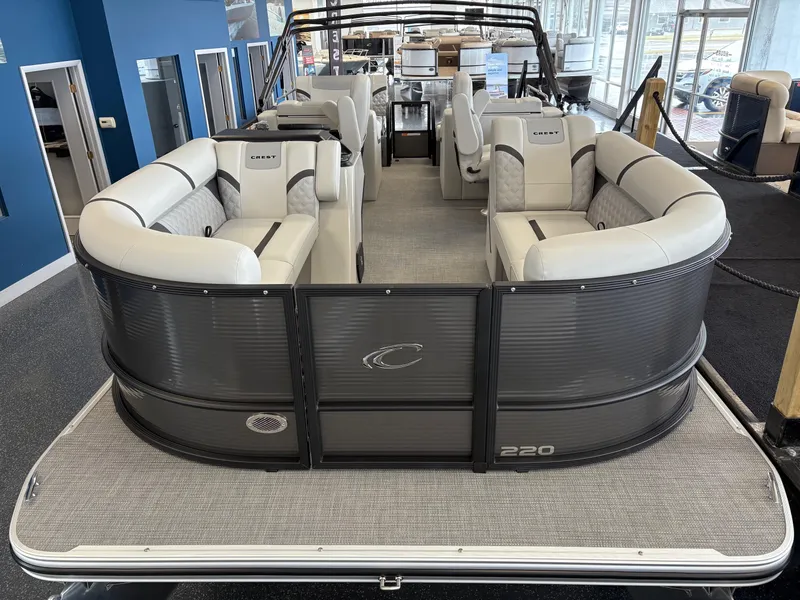 The 2025 Crest 220 SLRC Classic LX is a versatile pontoon boat designed for relaxation and adventure on the water. With a length of 22 feet, it offers ample space for passengers and features a rear chaise lounge for comfort. Its thoughtful design includes a powder-coated bimini top and a well laid out helm station with advanced marine technology to ensure safety, control, and convenience.