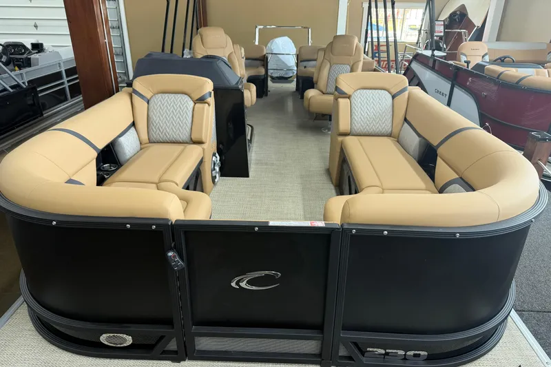 2026 Crest Caribbean 230 SLC Tri Toon powered by a Mercury 300hp V8. Equipped with an Easy Cover. Features include Raised Helm Stand, Simrad NSX touchscreen GPS fish finder, Fusion Bluetooth audio with Amp and Subwoofer, Wireless charge pads in seat back cubbies, RGB lit speakers, Lillipad Easy Step boarding ladder, Ski Tow Bar
