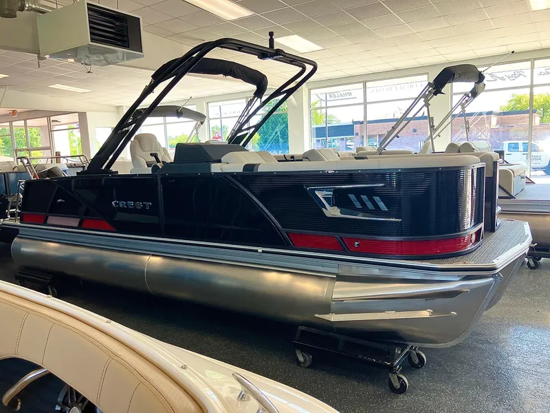 The Crest Marine 230 Caribbean SLS RS is a pontoon vessel that combines entertainment features with agile handling. Its powder-coated perimeter fencing features a dramatic flare aft, complemented by an optional clad tower overhead. The molded accent on the fence lights up, as do the interior speakers in various shades. The helm showcases a billet aluminum dash with aircraft-style lighted toggles. Passengers can stretch out on the 7-foot parallel lounges, and the seat bases are sleek, molded fiberglass. The 250 SLS model features Crest's CP3 Performance Package, including twin 25-inch outer tubes around a central 26-inch tube pontoon dropped 1 inch to create a V-hull effect.