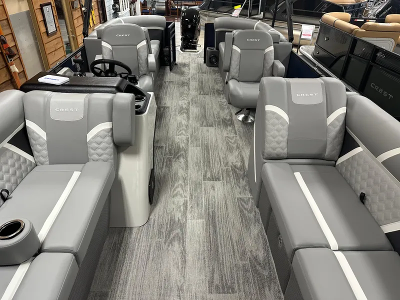 2025 Crest Classic 220 SLSC swing back lounge seating. Powered by a Mercury 115hp. Standard Features include Fence mounted docking lights, tilt steering wheel, Bluetooth Fusion audio with four 6.5" Blue LED lit speakers, In Dash Lowrance Eagle fish, Depth, GPS features, captain cooled cupholder, wireless phone charging holder, Dog dish food and water bowl drawer, 26" mid back reclining captains chair(s), Port bow seat pull out cooler drawer, USB and Type C charge ports, Bimini top, Stainless Steel telescopic 4 step ladder and a Mooring Cover. Optional upgrades on this boat include Stainless Steel ski tow bar and Stainless Steel stern safety rail and chains