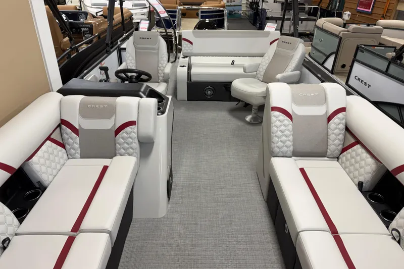 2026 Crest Conquest 230 SLSC. Powered by a Mercury 115hp Command Thrust. Features of this boat include the Swingback lounge seat, Reclining Captain and Co Captain chairs with Swivel/Slider bases, Mid Ship flip up table, Port side pullout cooler Drawer, Dog Dish bowl drawer, Fusion Audio with Bluetooth, Lowrance In Dash GPS Fish Finder, Captains cooled cupholers, Seat Back cubby with Cupholders, Phone hold and USB/USB-C charge ports, Ski Tow bar with Stern Safety rail and chains, Telescopic 4 step stainless steel boarding ladder, Bimini Top and a Mooring Cover.