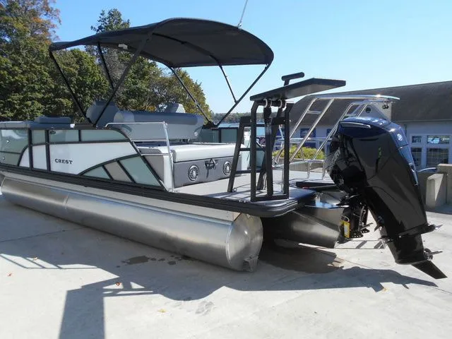 Here we have our 2026 Crest Conquest 230 SLSC tri-toon with a Mercury 200hp. Standard features like: port side cooler, GPS, mooring cover, captains cooled cup holder, and in dash phone charger. Options like: Black out Badging, Lilipad Diving Board, Dual Battery w/switch, Hydraulic power assist steering, Mid ship table, powder coated deck trim, Power Bimini, Premium Audio, Ski tow bar, raised helm stand, and triple pontoon package. Listed price includes all options, freight, and dealer prep.