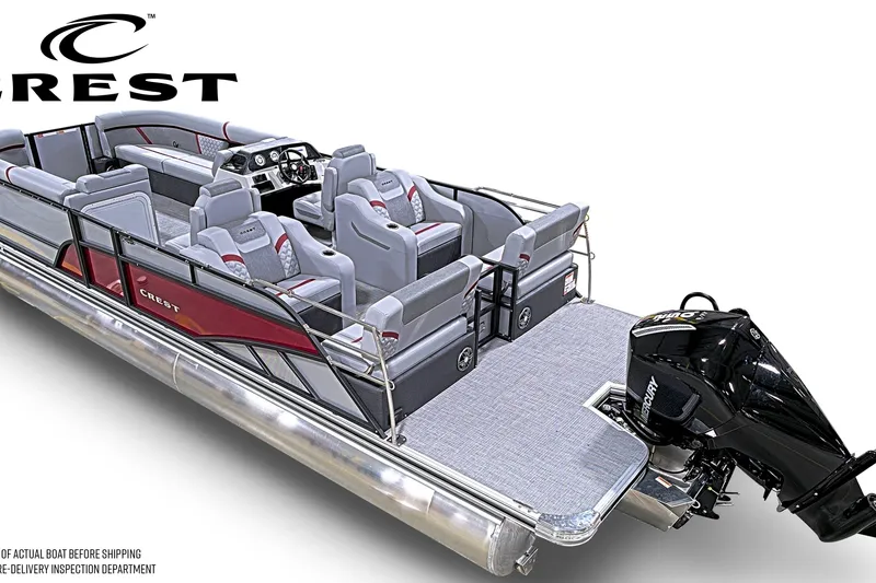 2026 Crest Conquest 250 SLRC Tri Toon. Powered by a Mercury 250hp V8 Outboard. This boat is Silver with Cabernet accent Exterior. Features of this boat include three 25" diameter pontoons, lifting strakes, aluminum skinned underdeck, 48 gallon fuel tank, Sea Star Power assisted hydraulic steering, Stainless Steel Ski Tow bar, Stern Safety Rail and Chains, Lillipad Easy Step boarding ladder, Fusion Bluetooh Premium Audio with 6 M6 speakers, Subwoofer and amplifier. Lowrance indash Fish Finder GPS unit, Captain cooled cupholder, captains wireless phone charge pad, Reclining captain and co captains chairs with swivel/slider bases, port bow pull out cooler drawer, dog dish pullout console drawer, mid ship flip up table, Bimini top and a Mooring cover.