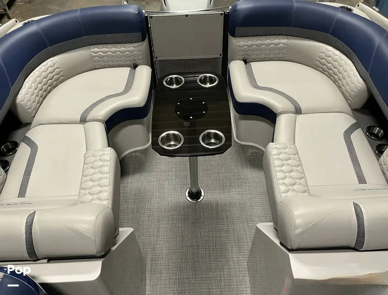 The defining feature of this flagship model is its sleek, integrated full-walkthrough windshield, which offers superior wind protection and a sophisticated automotive aesthetic not found on standard pontoons.