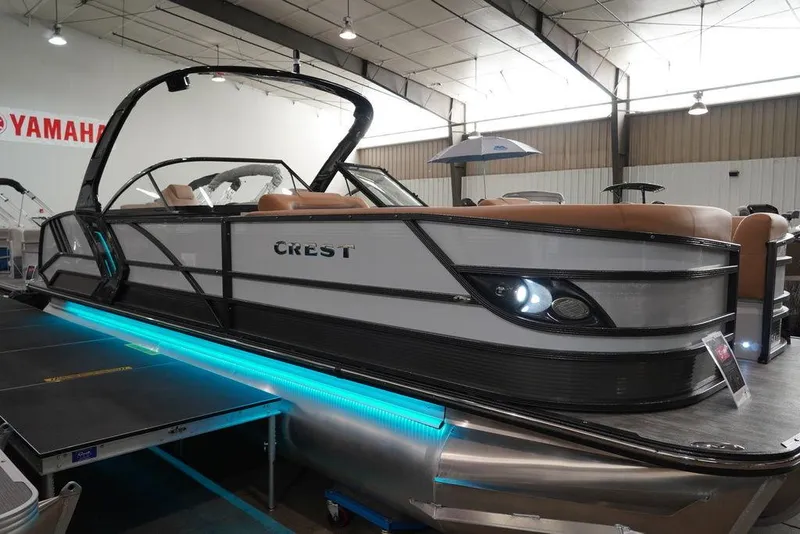 Enjoy ultimate luxury and performance on a Crest Continental. Customizable from the inside out, we deliver only the best materials and technology for you to choose from. Bring the whole crew and stay out all day on the water with standard bow coolers, options for entertainment tables, more dry storage, a powder-coated deck trim, and an optional cladded arch with gas assist. The full-size walkthrough windshield sets this tritoon apart from the others you'll see on the water. Bring life on the lake to a whole new level with the superior features found on the Crest Continental.