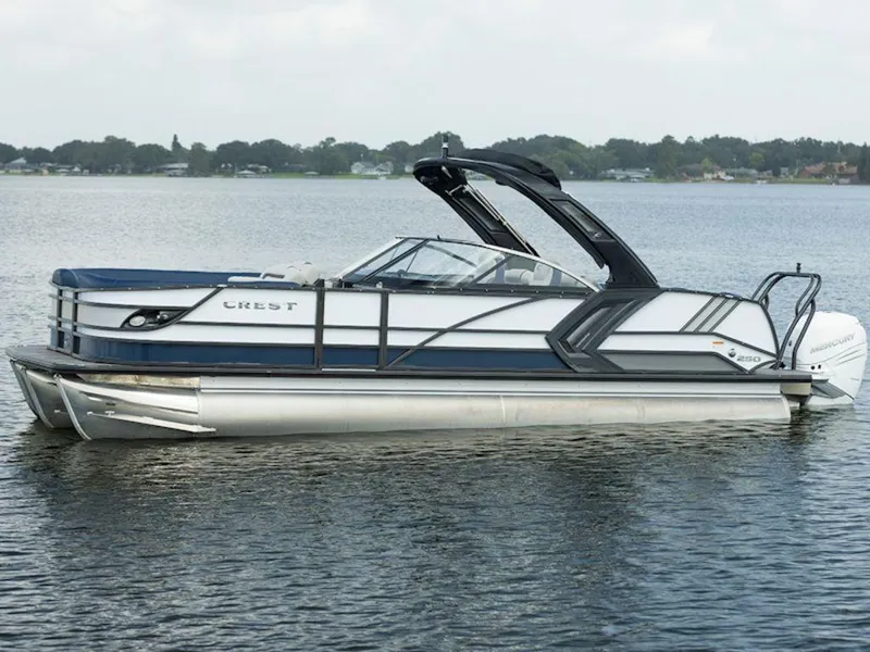 Enjoy ultimate luxury and performance on a Crest Continental. Customizable from the inside out, we deliver only the best materials and technology for you to choose from. Bring the whole crew and stay out all day on the water with standard bow coolers, options for entertainment tables, more dry storage, a powder-coated deck trim, and an optional cladded arch with gas assist. The full-size walkthrough windshield sets this tritoon apart from the others you'll see on the water. Bring life on the lake to a whole new level with the superior features found on the Crest Continental.