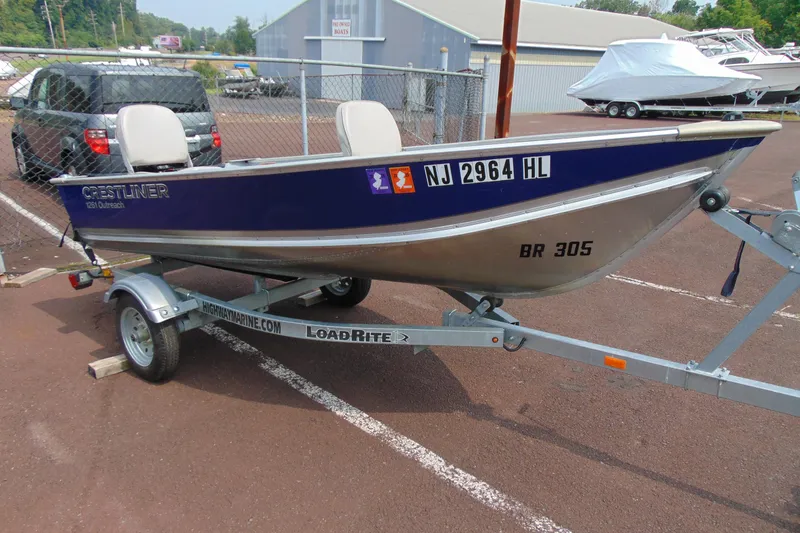 Nearly new 12' Crestliner Outreach tiller. Perfect for just about any limited hp lake, including New Jersey. This boat will move right along on the lake for a full day of fishing. Comes with two swivel high-back seats and a cover. Also includes a galvanized with 12" wheels and a tongue jack. All fresh water use.