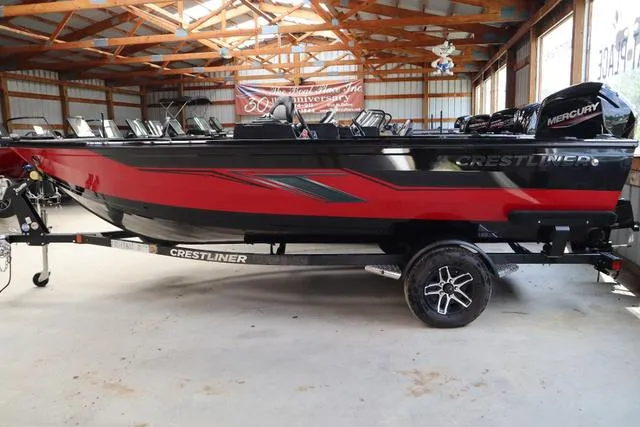 2024 Crestliner 1650 Fish Hawk JS SC, Price includes a Mercury 90EXLPTEFI 4-stroke, aluminum prop, Premium painted black trailer with diamond fender steps, mag wheels, swing tongue and wind guides, vinyl cockpit floor, two fishing seats, rear jump seat Midnight edition Package (Black Windshield, Black flip up cleats, Black steering wheel, Black Smoke Graphics, Black Smoke 3D chrome Crestliner logo, Black Smoke model designator), ladder, bow 12 gal livewell and stern 10 gal livewell with timer, auto bilge pump, bow trim switch, Humminbird Helix 5 GPS G3 Chirp Sonar, MinnKota PowerDrive 55/54 FP trolling motor, and two batteries. Price includes dealer prep and freight and all factory rebates. Color is Black Metallic with Fire Red Accent.