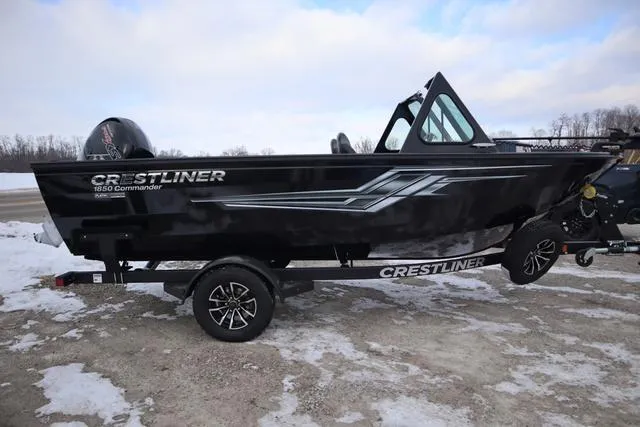 2025 Crestliner 1850 Commander, Price includes a Mercury 150XL Pro XS 4-stroke, Stainless prop, Hydraulic steering, Basic Bunk Single Axle Trailer, ratchet tie downs, Vinyl floor, cockpit & decks w/treated panel flooring, Pro Driver seat and & Passenger Seat w/ Box Storage and 1 Movable Fishing Seat with standard pedestal, Two additional seat bases in Cockpit Floor, Port and Stb Console Box Seats w/ Storage, Platinum Edition (Includes Platinum Edition hullside badge, 3D chrome hullside Crestliner logo, Compression latches (stainless steel), Cup Holders (stainless steel)), Bow 18 gal Insulated & Aerated, All Aluminum Console & Heavy Duty Windshield, Bow Fishing Package (Bow Seat Base, Bow Trim Switch, Bow Trolling motor outlet with Harness, Wash Down System, Minn Kota Powerdrive 24V 70/60 DSC FP, Humminbird Helix 5 Chirp GPS G3 @ Console and three batteries. Factory Travel Cover & Transom Saver. Price includes dealer prep and freight and all factory rebates. Color is Complete Metallic Black w/ Clearcoat