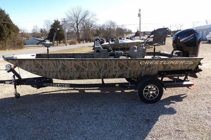 New 2026 Crestliner 1860 Retriever Side Console in Mossy Oak Shadowgrass Blades. This boat is powered by a Mercury 90 hp 4-Stroke Motor. This boat includes an upgraded Bear Trailer, Bow Trim Switch, 24 Volt Bow Trolling Motor Plug with 6 Gauge Harness, Horn, Windshield, Gauge Package, Welded Transducer Bracket, Automatic Bilge Pump, Bench Seat Exchange, 2 Millennium Seats with Pedestals, Mercury Aluminum Prop, Interstate Cranking Battery, and much more.