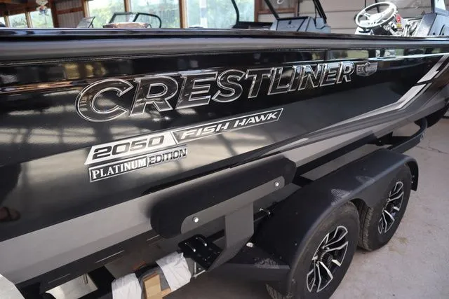 2026 Crestliner 2050 Fish Hawk WT JS, Price includes a Mercury 200XL Pro XS 4-stroke EFI V8, Stainless prop, Hydraulic steering, Basic Bunk 4000lb Tandem Axle Trailer w/ Brakes, ratchet tie downs, Mag Wheels, Vinyl Cockpit Floor, Pro Driver Seat and Two Pro Fishing Seats with Pedestals, Platinum Edition (Includes Platinum Edition Hullside badge, 3D chrome hullside Crestliner logo, Compression latches (stainless steel), Cup Holders (stainless steel)), Bow Cargo Nets, Bow 12 Gal Aerated and Aft 28 Gal Aerated Livewell - Both with Timer, USB Charging Port, Sport Package (stereo w/ 2speakers, ski pylon and stbd side swim platform), Minn Kota Powerdrive 24V 70/60 DSC FP, Humminbird Helix 5 Chirp GPS G3 @ Console and three batteries. Factory Travel Cover & Transom Saver. Price includes dealer prep and freight and all factory rebates. Color is Metallic Black with Silver accent.