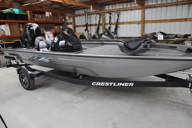 2025 Crestliner XFC 18 Crappie, Price includes a Mercury 115ELPTEFI PRO XS 4-stroke, Karavan Trailer with Swing Tongue and Ratchet Tie Downs, Two 23 Gallon Aerated Livewells with Timer, Fiberglass Console with Lit Toggle Switches, Multifunction Black Sterling Gauges (Speed/Fuel & Tach/Trim), Horn, Pro Package (Automatic Bilge Pump, Recirculating Pump for Stern Livewell, Upgraded Steering Wheel, Insulated Lids, Windscreen, LED Interior Light Pkg), Driver and Passenger Pro Seats, Minn Kota Edge 70/45 24V Trolling Motor, Recessed Trolling Motor Foot Pedal, Welded on Transducer Bracket, 3 Bank Charger and 3 Batteries, Color is Silver Metallic w/ Gray Interior.