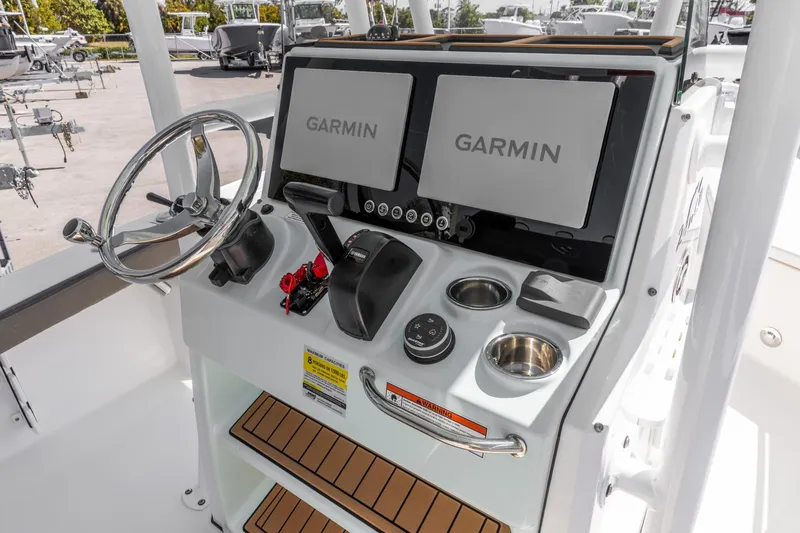 - Custom fiberglass leaning post with backrest, rigging tray, tackle storage, sink, glove boxes, removable cooler, cup holders & rod holders.
