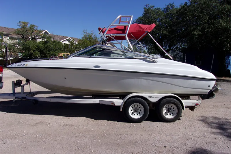 2002 Crownline 202, Mercruiser 5.0 MPI, 260HP, 893 Hours, Bravo 3 Dual Prop, Tower with Rack, Bimini Top, AM/FM CD Bluetooth, Includes Tandem Axle Trailer.