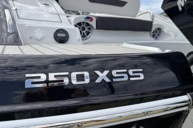 If you like the sleek, sports car styling of our "pointy nose" SS models, but prefer an outboard application, the exciting 2025 250 XSS could be just what you are looking for. And, as with all Crownline models, it is loaded up with customer-driven standard features to make your on-water times the best ever! The overall length with engines is 26' 10". This boat features a performance tuned Mercury 300 Four Stroke XL engine with DTS controls. 300 horsepower in a fiberglass boat, built on the F.A.S.T. Tab hull is guaranteed to maneuver and perform like a dream. The 250 XSS offers a roomy cockpit and bow area with room for all of your family and friends. The aft electric sun lounge has dual actuators so you can position yourself in comfort. The Social Swim Transom design includes two transom Wet Sounds speakers, for the best sounding tunes on the water!
