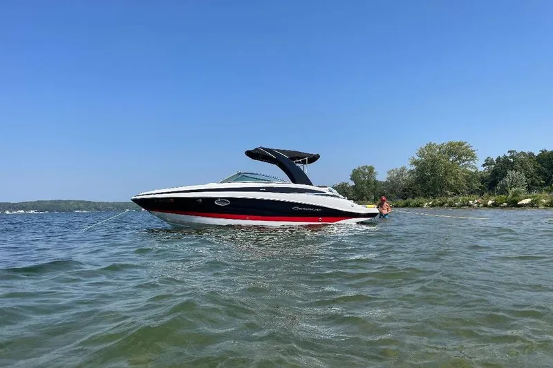 Very Clean 2014 Crownline 255SS comes with Mercruiser 350 MAG engine (315 engine hours) with Bravo III sterndrive and tandem axle marine trailer. Options include LED lighting package, black aluminum Arch with suntop and electric fold down, side mount table, teak mat for rear swim platform, heavy duty bow flip up arm rests, stainless steel windshield lock, electric flush head, and highlander carpet.
