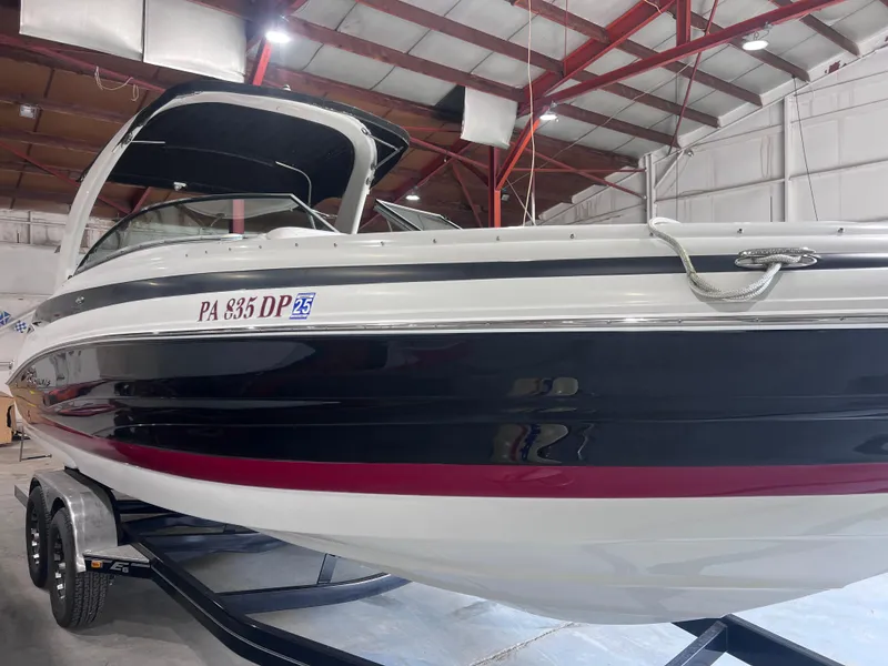 This is truly a real functional family friendly boat with its Yacht certification it can handle the whole gang powered by a 179 Hours on her Mercruiser 377 Mag Fuel injected engine and paired with the Bravo III drive it packs plenty of punch to enjoy any type of watersports the family desires with the optional trim tabs with indicator you can control the ride comfort with ease. With the optional Power Aluminum Arch it makes the boat even more stunning along with the ability to lay it down with ease for trailering and storage. Windlass makes anchoring the boat something a 5 year old can do the led interior and underwater lighting makes this boat stand out at night and with the enclosed head with electric head and sink you can spend hours out on the water without have to come back in till your done for the day two on board coolers make it easy to bring all you will need along with storage under the seats and a X large lockable floor storage locker all your gear will have a place. Red accent strip added to make this girl pop. See MSRP sheet for details. This girl was $112,780 new, a steal for $69,900. Some pictures are stock. DOES NOT INCLUDE TRAILER SHOWN. OPTIONAL NEW VENTURE VATB-8725 TRAILER $7,393.