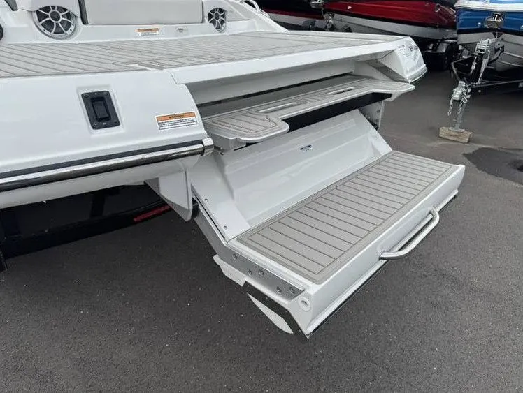 UPGRADED MERCRUISER 8.2L 380 HP W/DTSAdditional Features: Upgraded MerCusier 8.2L 380 HP w/DTS, Power Drop Down Swim Platform w/ Boarding Assist Handle, Arch - White Aluminum GEN 2 Power Folding Arch w/Suntop Main Color: Slate, Accent Color: Black, Interior - Deluxe Color Matched (Slate Accents), Power Dash - Black Shroud w/Double Stitch & Switches & Billet (Exch.), Head - Upper Cabinet, Fender Clips - 4 Bases w/4 Inserts, Trim Tabs w/Indicators, Performance Amplified Stereo System w/Sub and Heritage Tandem Axle Trailer.